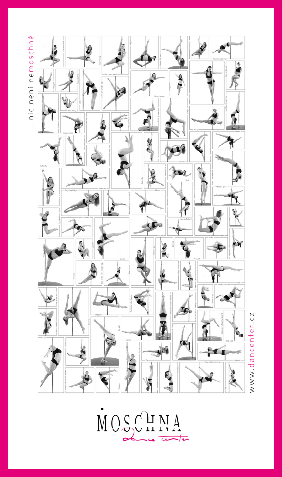 | POL1 | Úroveň 1 | Potřebujete umět: nebát se přijít a postavit se k tyči Učí se: Fireman, Fronthook, Backhook, Carousel, Boomerang a variace, Craddle, Jelen, Šplh, Stoj, Sed, Layback – přímý, boční, V-invert, Crucifix inverted, Padající bohyně Armpithold |